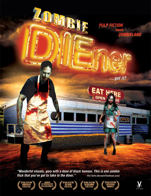 Stop in and get a bite! Ken (Josh Grote) is a wandering and unassuming serial killer who enters a forsaken and empty diner during the graveyard shift. After a long conversation with the diner’s lone waitress Rose, (Maria Olsen) Ken kills her and promptly delivers the same fate to the diner’s cook Fred (Jorge Montalvo). As Ken cleans up the bloody mess and deposits Rose and Fred in the walk-in freezer, company arrives. A young, unhappy married couple Rob (Parker Quinn) and Kathy (Liesel Kopp) stop by the diner only to be followed by the arrival of Sheriff Duke Purdett (Larry Purtell). Ken now finds himself in the middle of a rousing game of cat and mouse which he manages well until the unthinkable happens. Back from the dead, Rose and Fred emerge from the freezer and start walking around! Once an unflappable serial killer, Ken now holds the young couple and wounded sheriff captive, trying frantically to escape the zombie predators! DIEner ...get it? is a zany, horror-filled escapade and wild zombie invasion!